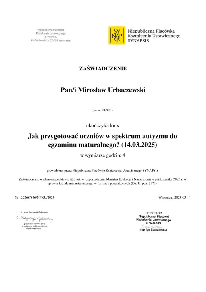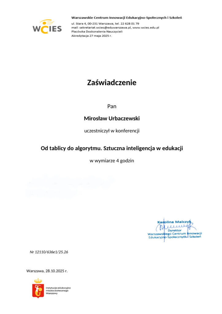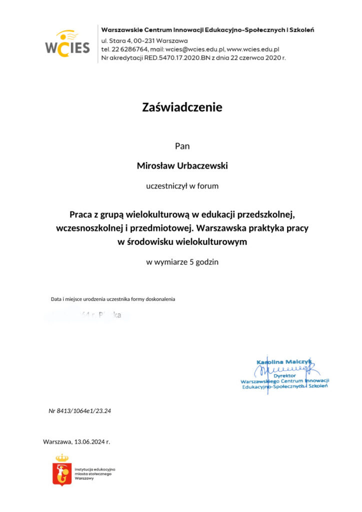 Ostatni egzamin wiedzowy zdałem w 2024 z „edukacji w kontekście migracji. Praca z klasą wielokulturową na zajęciach przedmiotowych. Uwrażliwienie językowo-kulturowe” z wynikiem bardzo dobrym. Bardzo ciekawa wiedza i poczucie czegoś nowego co podyktowały warunki ekonomiczne i społeczne naszego kraju. Rok wcześniej ukończyłem studia podyplomowe, w zakresie „Zarządzanie cyberbezpieczeństwem” równie z wysokim wynikiem to to też bardzo ciekawe, człowiek nie zdaje sobie sprawy ile niebezpieczeństw w cyfrowym świecie na niego czeka. Od tego czasu używam kluczy bezpieczeństwa do zabezpieczenia moich działań w sieci.